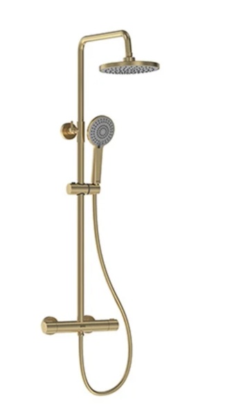 The Buzz bar mixer shower brings warm brushed brass styling to create your personal spa experience with height-adjustable overhead drenching and multi-function handset. Thermostatic controls ensure family-safe showering with preset temperature stops, while the complete kit includes everything needed for straightforward installation.